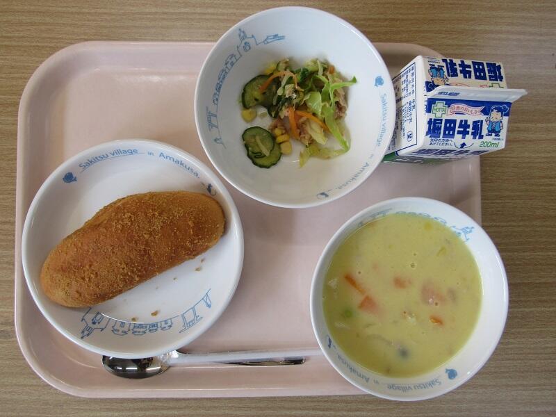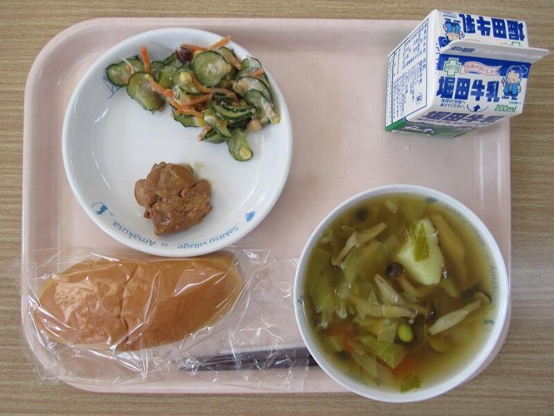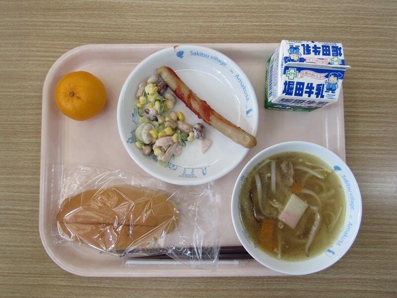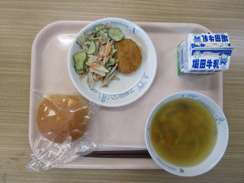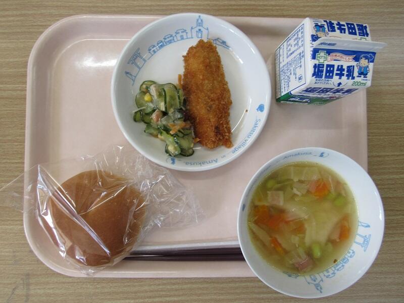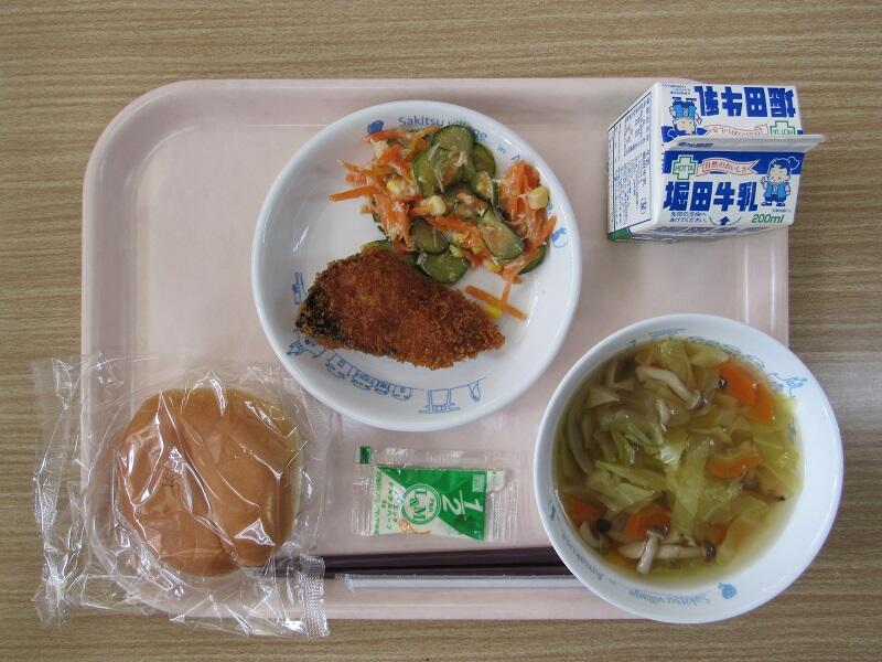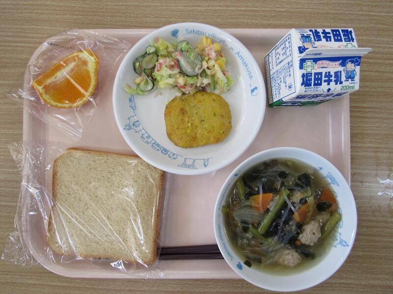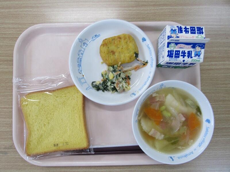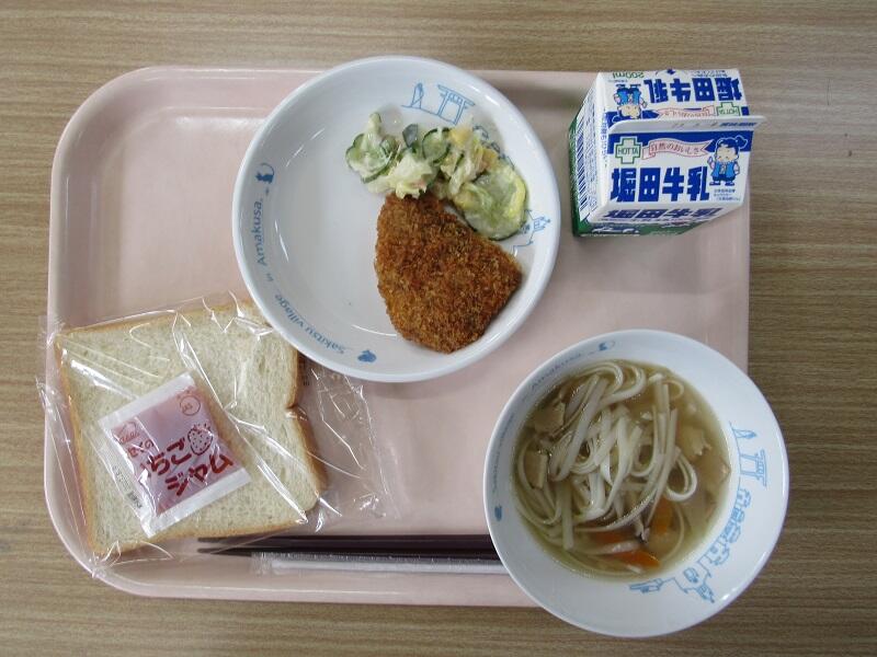 食パン、イチゴジャム、平めんスープ、かぼちゃフライ、コーンチキンサラダ