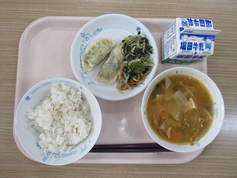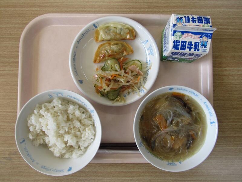 麦ごはん、春雨スープ、ぎょうざ、中華和え