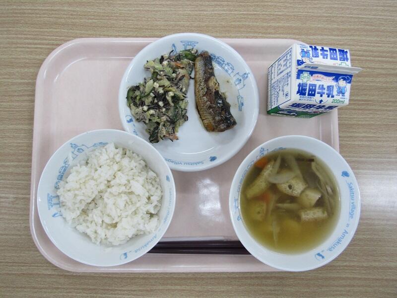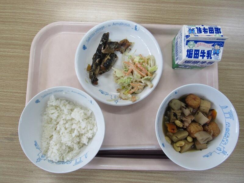麦ごはん、けんちん汁、いわし生姜煮、ひじき和え物