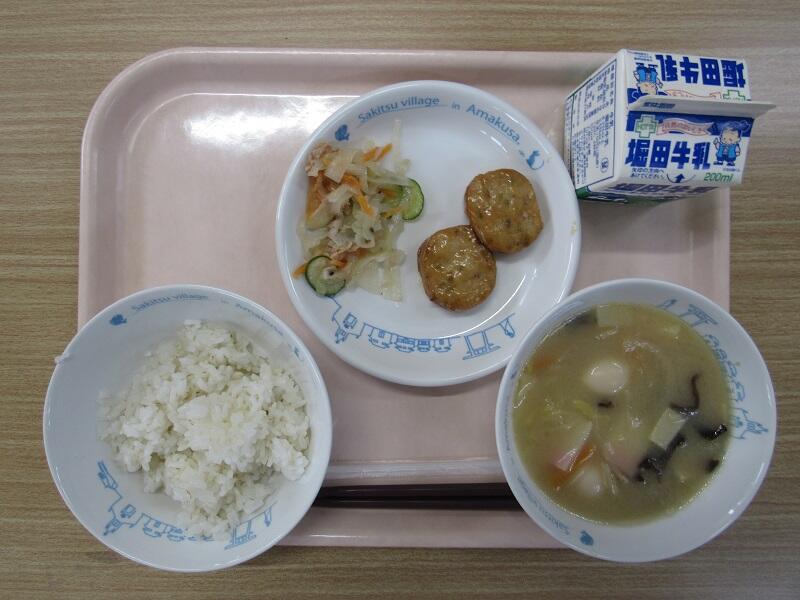 麦ごはん、つみれ汁、鯖ゆず味噌煮、サラ玉和え