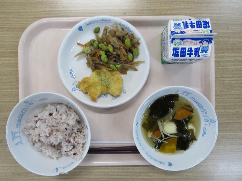 古代米ごはん、はんぺん汁、鶏の天ぷら、五目きんぴら