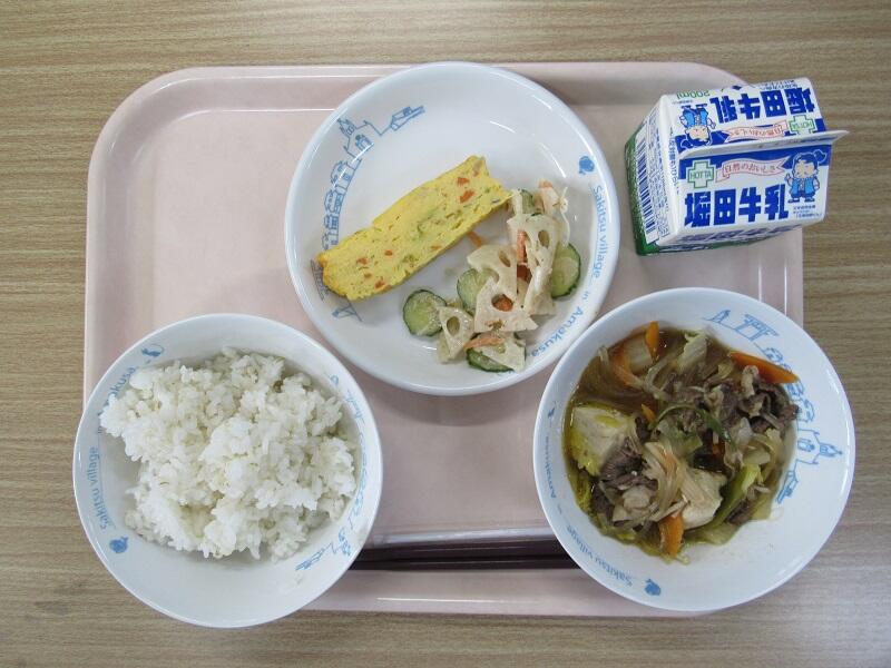 麦ごはん、すきやき、厚焼き卵、れんこんの和え物