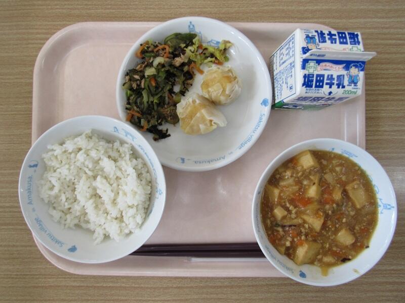 麦ごはん、マーボー厚揚げ、にんじんシューマイ、かつのりサラダ