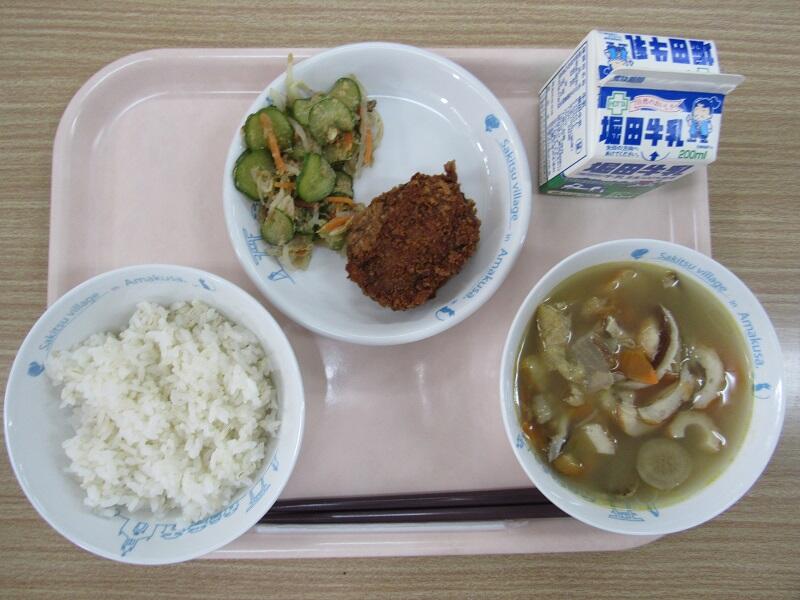 麦ごはん、栄養すいとん、くじらメンチカツ、シモンドレッシング和え