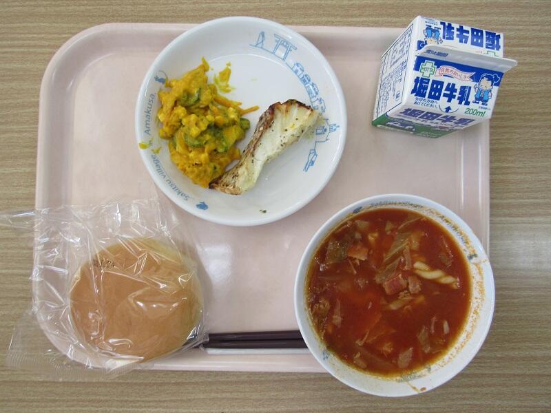 丸パン、ミネストローネ、天草真鯛のバジルオリーブ焼、かぼちゃサラダ