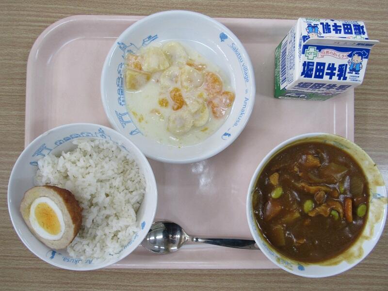 麦ごはん、天草大王のカレー、スコッチエッグ、フルーツヨーグルト