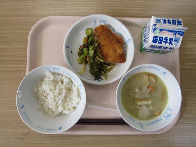 麦ごはん、豚汁、ヒラダイのフライ、しそ昆布和え