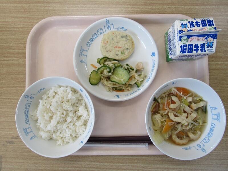 麦ごはん、親子煮、和風きんぴらつつみ焼、ちくわのごま和え