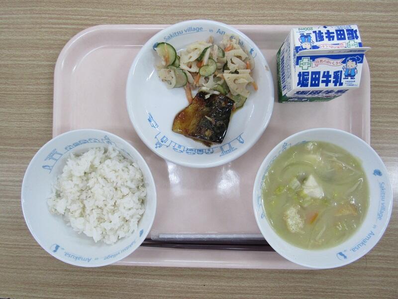 麦ごはん、白菜の味噌汁、鯖のみぞれ煮、れんこんの和え物