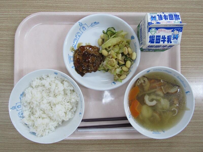 麦ごはん、のっぺい汁、れんこんとひき肉の照焼、大豆の和風ドレッシング和え