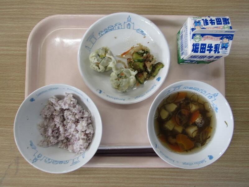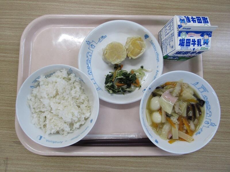 麦ごはん、中華うま煮、にんじんシューマイ、ほうれんそうのささみ和え