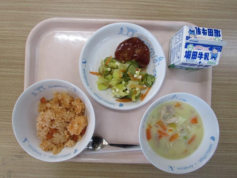 チキンライス、コーンクリームシチュー、ハートのハンバーグ、イタリアンサラダ