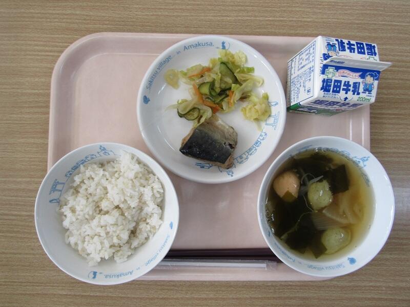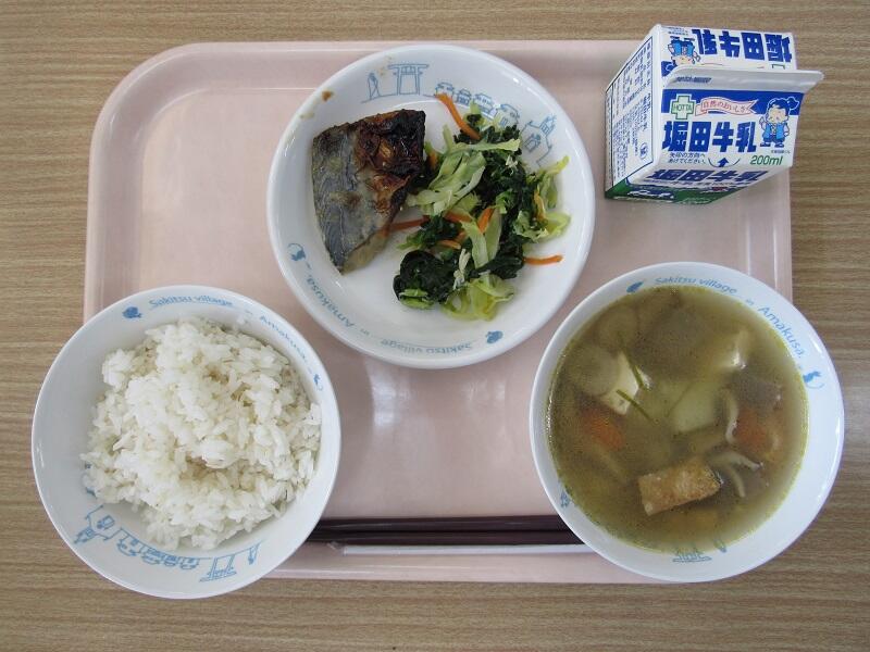 麦ごはん、さつま汁、鯖(さば)の塩焼、白菜のごまネーズ和え
