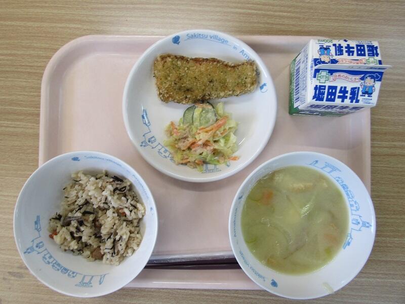 ひじきごはん、根菜の味噌汁、ホキ点玉揚げ、マヨネーズ和え