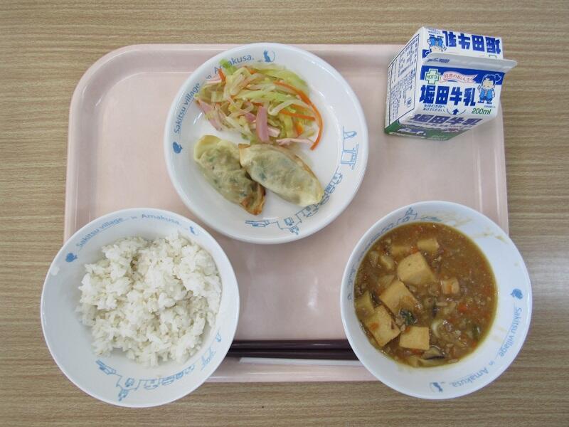 麦ごはん、マーボー厚揚げ、餃子、中華和え