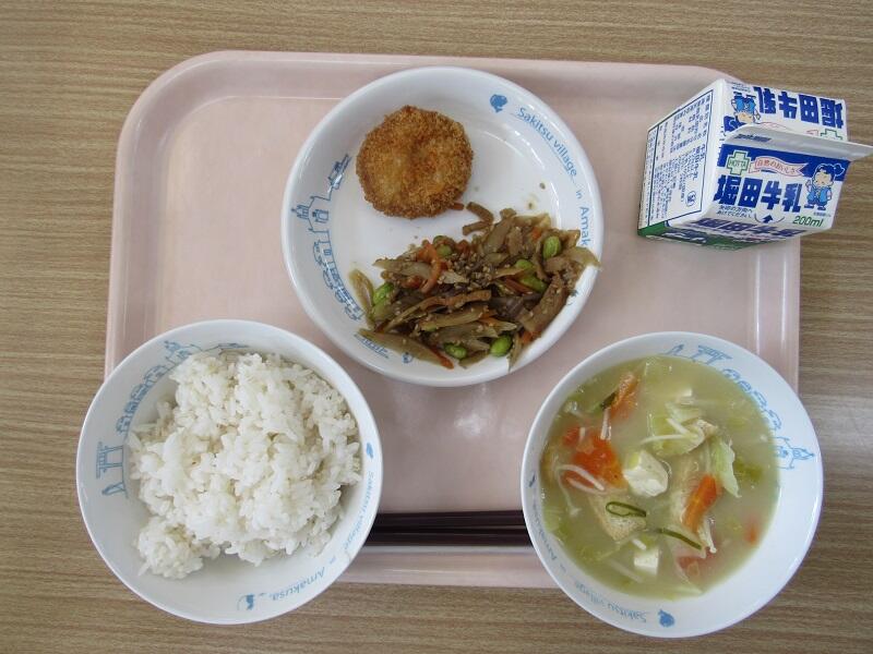 麦ごはん、春野菜の味噌汁、大豆とごぼうのミンチカツ、五目きんぴら