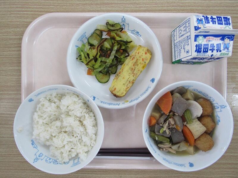 麦ごはん、里芋のうま煮、五目厚焼き卵、昆布和え