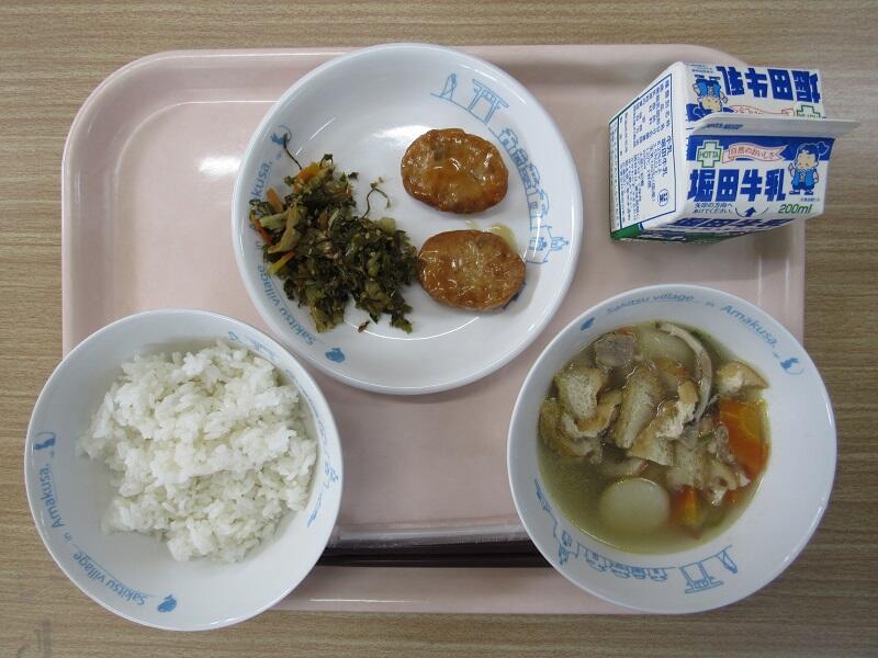 ぷちまるごはん、だご汁、れんこんつくね、高菜油炒め 3月16日(木)