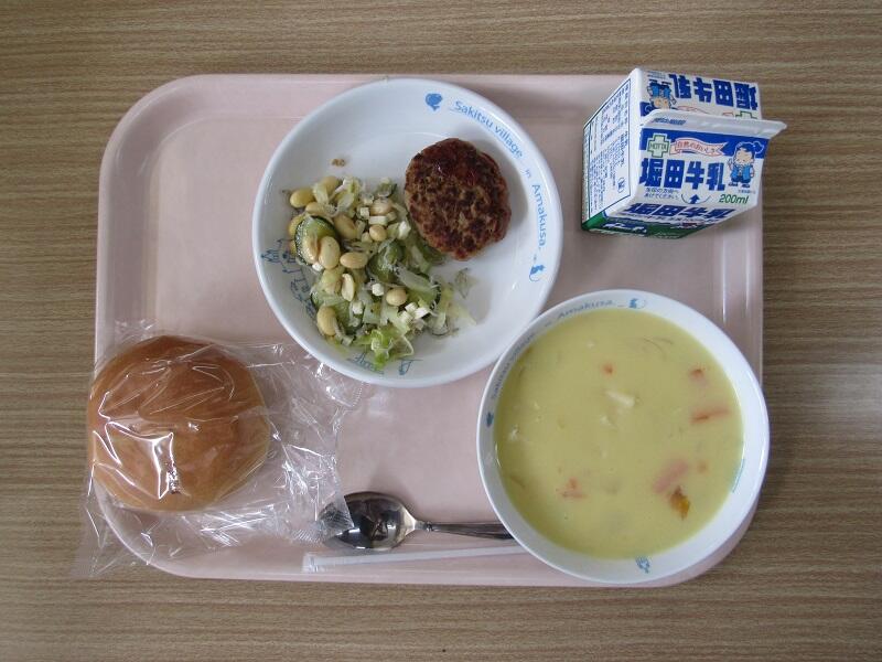 丸パンカット、マカロニのクリーム煮、ハンバーグ、じゃこと大豆のサラダ