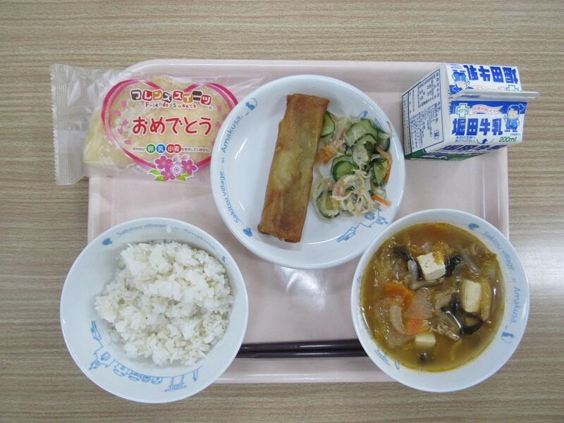 麦ごはん、チゲ風スープ、春巻き、棒々鶏サラダ、お祝いクレープ