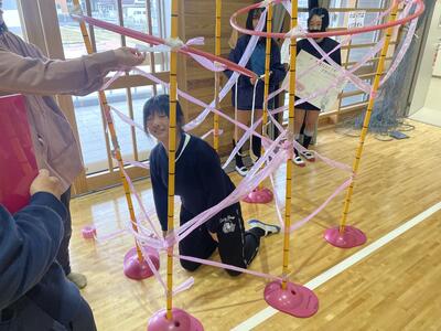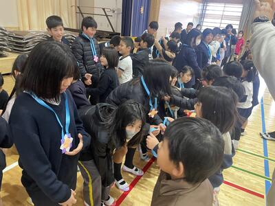 〇「プレゼントタイム」では、1年生から6年生全員に折り紙のメダルが贈られました。