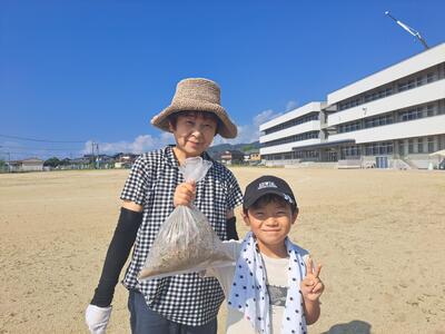 そんな中、誰もいない土曜日の運動場に2つの人影が。なんと2年生の男の子が、「きれいな運動場にしたい」と、休みの日に運動場に草取りに来てくれていたのです。そして、その男の子の提案に、おばあちゃんが一緒に草取りを手伝ってくれていたのです。熱い日差しの中にも関わらず、汗いっぱいになりながら草取りをがんばってくれました。