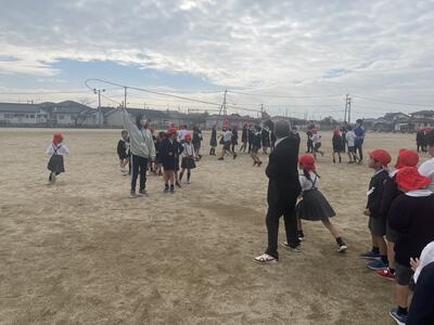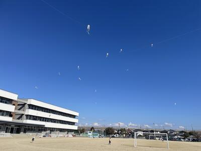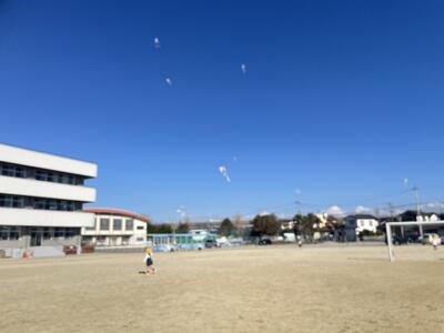 1年生は、生活科の授業で「むかしのあそび」を学んでいます。その一環として、お正月のあわせて手作りのたこを使ってたこあげに挑戦しました。雲ひとつない青空に、子供たちのたこが高く舞い上がりました。