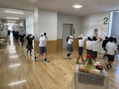 子供たちが楽しみにしていた送別遠足は、会場を予定していた竜燈公園のグラウンドコンディション不良のため、校内遠足に変更して実施しました。児童会主催の「6年生を送る会」では、「じゃんけんゲーム」「6年生〇✕クイズ」「じゃんけん列車」等の全員遊びで盛り上がり、「プレゼントタイム」では、1年生から6年生全員に折り紙のメダルが贈られました。最後は、おうちの方の手作りお弁当をいただきました。