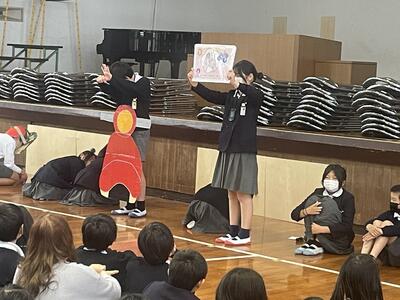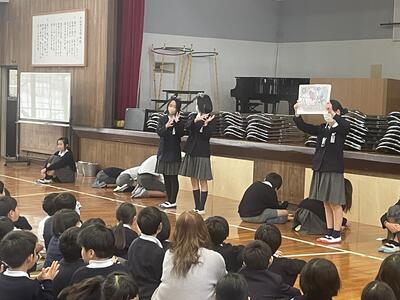 今年度最後の児童集会では、保健委員会が、「手洗いの仕方」について、音楽と小道具で楽しく分かりやすく発表してくれました。感染症の拡大が心配されるこの時期、子供たちにとっても自分の手洗いを見直すよい機会となりました。