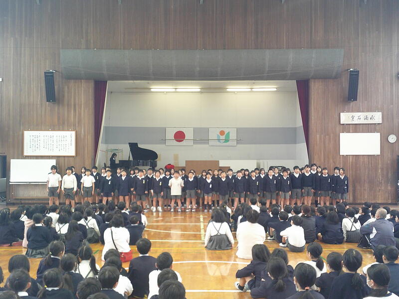 今年度、最後の音楽集会が行われました。今回は5・6年生の発表でした。5年生は在校生代表として卒業式に参加します。その時に歌う曲を1~4年生に紹介しました。卒業生である6年生も卒業式で歌う曲を紹介しました。5・6年生の歌声はとてもきれいでした。きっと、すてきな卒業式になると思います。