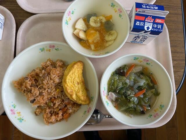 今日の献立は【牛乳、チキンライス、オムレツ、コンソメスープ、フルーツミックス】でした。いよいよ令和8年度がスタートしました。まだまだ緊張した様子の1年生、1学年上がり表情に頼もしさが増した2~6年生、新学期初日から学校内は活気に満ちていました。今年度最初の給食には「チキンライス」が出てきました。ケチャップの風味がほどよく効いていて、とても美味しかったです。デザートに「フルーツミックス」もついていて、子どもたちがとても嬉しそうにしていました。また今年度も美味しい給食を楽しみに頑張りたいと思います。甲佐町の給食に携われる皆様におかれましては、今年度もどうぞよろしくお願いします。