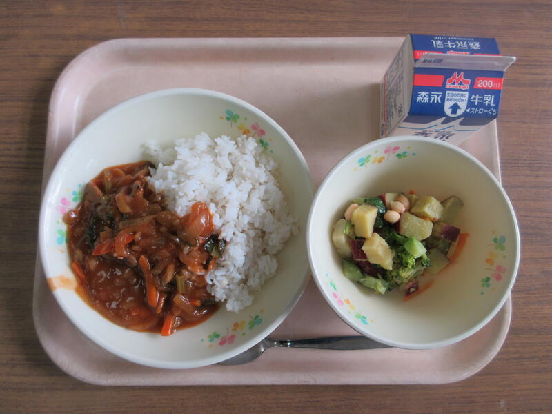 2026年最初の献立は【牛乳、ハヤシライス、さつまいものサラダ】でした。「ハヤシライス」には玉ねぎ、マッシュルーム、豚肉等、たくさんの具材が入っていました。給食準備の段階から、美味しそうな匂いが漂ってきて、久しぶりの給食に胸が躍りました。味ももちろん、とても美味しかったです。今年も美味しい給食を楽しみに、1年間頑張れそうです。今日も美味しい給食に感謝・感謝です。