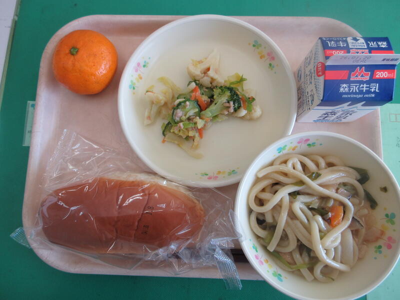 今日の献立は【牛乳、ミルクパン、七草うどん、花野菜のサラダ、みかん】でした。今日の注目メニューは「七草うどん」です。七草は「セリ、ナズナ、ゴギョウ、ハコベラ、ホトケノザ、スズナ、スズシロ」の七種類になります。一年の無病息災を願い、お正月のご馳走で疲れた胃腸を休めるために、この時期に七草を食べるという習慣が広がったそうです。お腹に優しい味わいで、とても美味しかったです。今日も美味しい給食に感謝・感謝です。