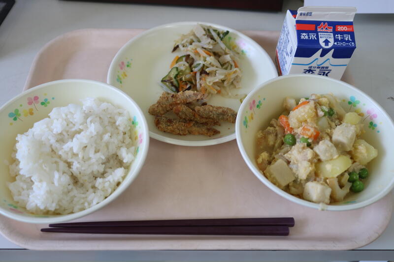 今日の献立は【牛乳、麦ご飯、小イワシの梅唐揚げ、高野豆腐の卵とじ、千草和え】でした。高野豆腐は、噛めばジュワ~と味がしみ出てきます。じゃがいも、グリーンピース、玉ねぎ、タケノコ、豚肉、ちくわなどが入っていました。卵のふんわり感、タケノコのカリッとした感じ、ちくわの柔らかい感じ、いろんな食感が楽しめてとても美味しかったです。また、小イワシの梅唐揚げも梅のほどよい酸味とカリッと揚げてある食感が楽しめました。今日も美味しい給食に感謝・感謝です。