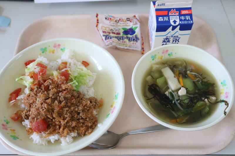 正解は3の日本でした。ひっかけは1のメキシコです。メキシコには「タコス」という料理があります。そのタコスをご飯と一緒に食べるという全く新しい味として沖縄で誕生したのが、タコライスです。スパイシーに味付けした挽肉、トマト、キャベツ、玉ねぎ、チーズで味付けしてあり、ピリッとした辛さを楽しむことができました。もずくスープは、豆腐、えのき、ちんげん菜、人参が入っていました。もずくと言えば、やはり沖縄です。もずくはツルツルッとしたのどごしでミネラルが豊富です。タコスやもずくを食べて暑い夏をのりきろう!今日も美味しい給食に感謝・感謝です。