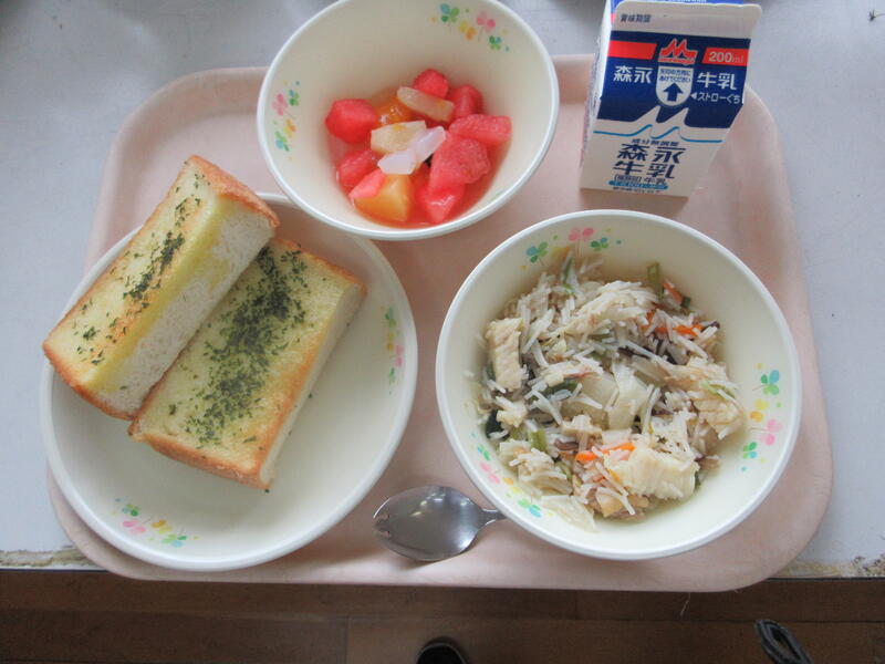 今日の献立は【牛乳、ガーリックトースト、焼きビーフン、フルーツミックス】でした。今日の主役は、ガーリックトーストです。まさか給食で食べられる日が来るとは思っていませんでした。ガーリックの香ばしさと、噛むたびにジュワッ!と出てくるバターの風味がマッチしており、いつの間にか口の中いっぱいに頬張ってしまう美味しさでした。フルーツミックスには、スイカ・パイン・ミカンというさっぱりしたフルーツが入っており、今日のような蒸し暑い日にはありがたい美味しさでした。今日も美味しい給食に感謝・感謝です。