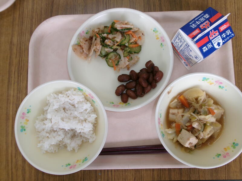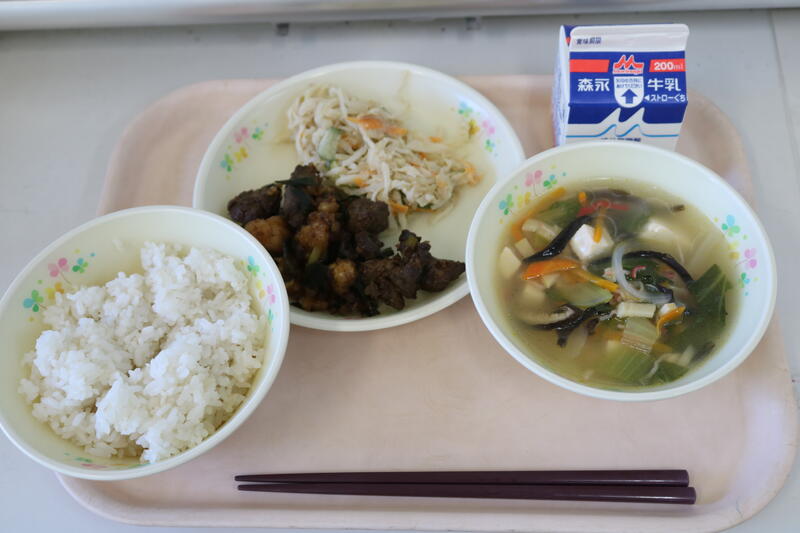 今日の献立は【牛乳、麦ごはん、肉どうふ、春雨の酢の物、ミニトマト】です。今日出てきたミニトマトは、甲佐町産の「アイコ」という品種だそうです。「美味しかった!」「甘かった!」などの声があり、大好評でした。肉どうふには、豚肉・豆腐・キャベツ・ニンジンなど味が染み込んだ具材がたっぷり入っており、ご飯が進むような味わいでした。春雨の酢の物にはスクランブルエッグが入っており、お酢の酸味をまろやかにしていたため、職員室では「子どもも食べやすいよね」という声が上がっていました。是非ご家庭でも真似されてみてはいかがでしょうか。今日も美味しい給食に感謝・感謝です。