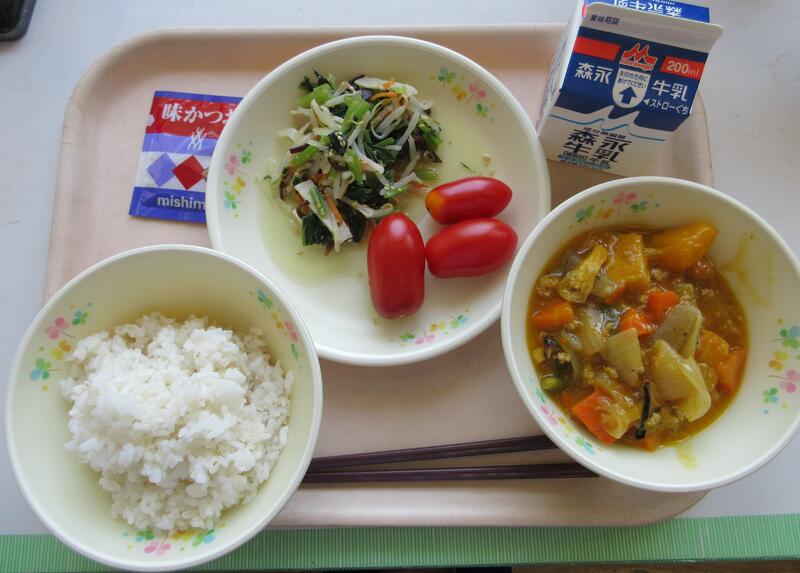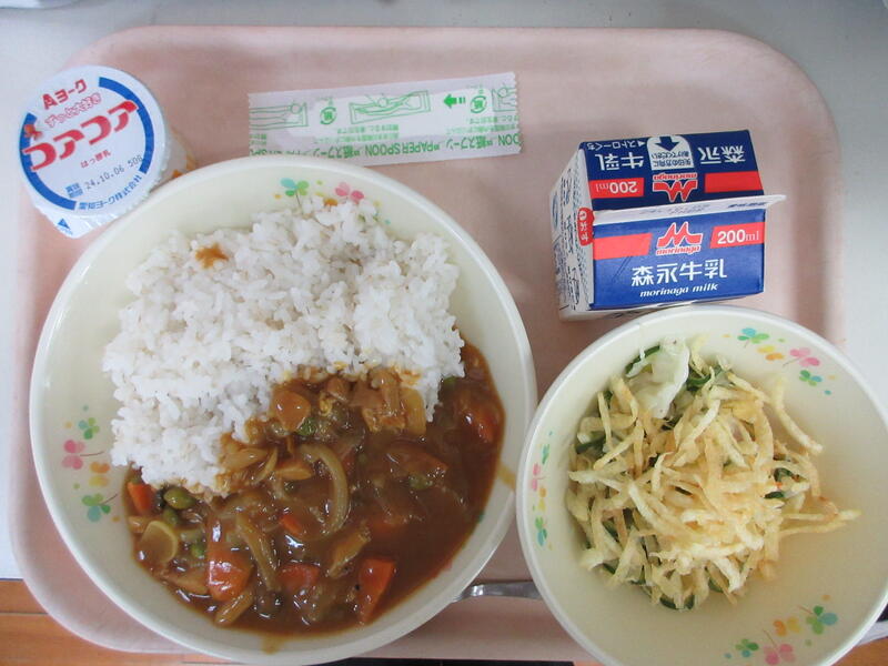 今日の献立は【牛乳、ドライカレーライス、じゃこサラダ、ヨーグルト】でした。1年生で「おかわりしたい人?」と担任が聞いたら、「は~い!」と全員が手を挙げたということで、やはり、カレーは大人気だなと思いました。今日のドライカレーには、豚肉、なす、ピーマン、人参、ごぼう、まめ、じゃがいもが入っていました。夏野菜のなすやピーマン、珍しい食材ではごぼうが入っていたのには驚きでした。また、じゃこサラダには、カシューナッツも入っていて、ちりめんの柔らかさとナッツの歯ごたえの両方が楽しめて美味しかったです。今日も美味しい給食に感謝・感謝です。