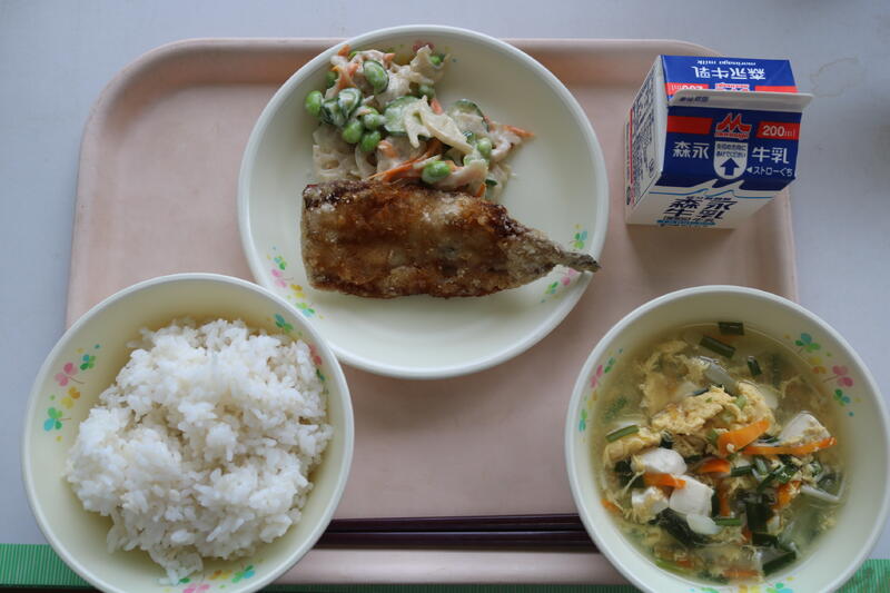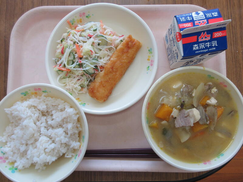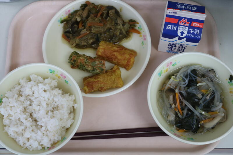 今日の献立は、【牛乳、麦ご飯、春雨汁、ちくわのにしょくあげ、なすの味噌炒め】です。今日の注目メニューは「ちくわのにしょくあげ」です。カレー味と磯辺揚げの二つの味が出てきました。カレー味のちくわは、風味が豊かで、辛みも強くなく、子どもたちにも食べやすいような味わいで美味しくいただきました。磯辺揚げは、青のりの香りが効いていて、食べ応えもあり、こちらも美味しくいただきました。一度に二つの味が楽しめて、ちょっと贅沢な気持ちになりました。今日も美味しい給食に感謝・感謝です。