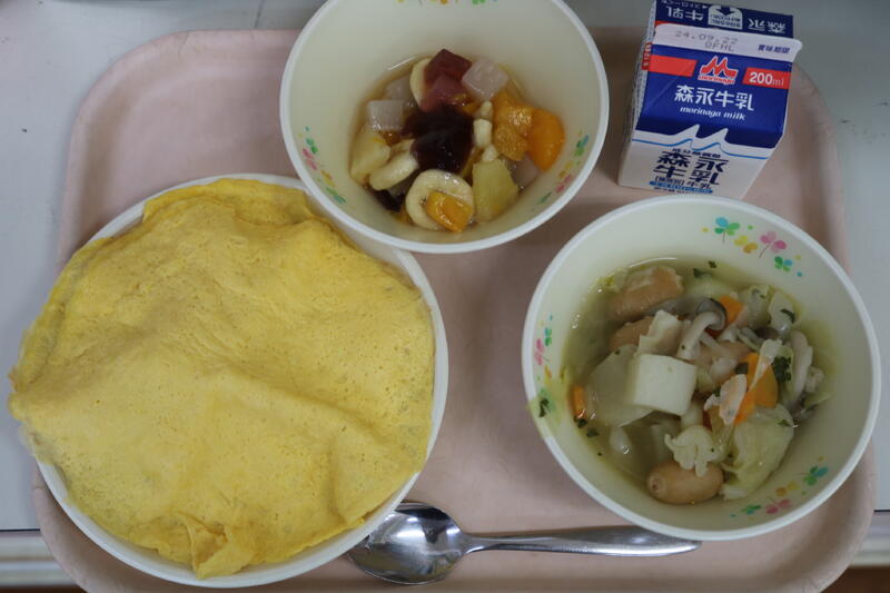今日の献立は、【牛乳、セルフオムライス、ポトフ、フルーツミックス】です。今日の給食には、みんな大好き「オムライス」が出てきました。給食でオムライスが食べられるとは、驚きでした。卵の下は、王道のチキンライスでした。ケチャップの風味が効いており、卵との相性も抜群で、とても美味しかったです。さらに今日は、デザートとして「フルーツミックス」も出てきました。ミカンやバナナ、ゼリーなどが入っており、とても甘く、サッパリしていて、こちらもおいしくいただきました。今日も美味しい給食に感謝・感謝です。