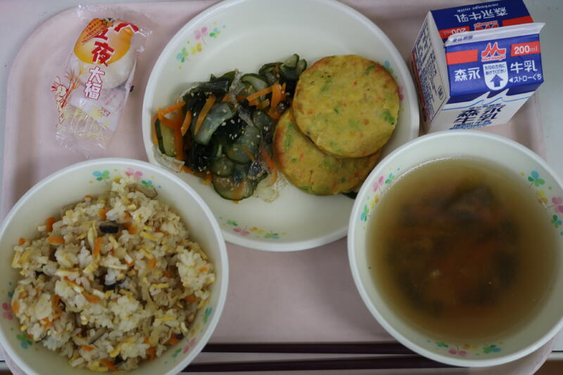 今日の献立は【牛乳、たこ飯、卵焼き、けんちん汁、ごま酢あえ】でした。今日の主役は何と言っても「たこ飯」です。実は今、このたこの値段がとても高いのをご存知ですか? 家庭用でたこ焼きをしようとしてもスーパーで1パックに足2本ぐらい入っていて700円~800円という値段に目が飛び出ていました。今日のたこ飯には、たこ、しいたけ、えだ豆、人参が入っていましたが、たこを噛んだ時のかつおや昆布でとった出汁の美味しさを感じてとっても美味しかったです。普段はまず食べない「たこ飯」。しっかり噛みしめて歯ごたえと味を楽しみました。今日もおいしい給食に感謝・感謝です。