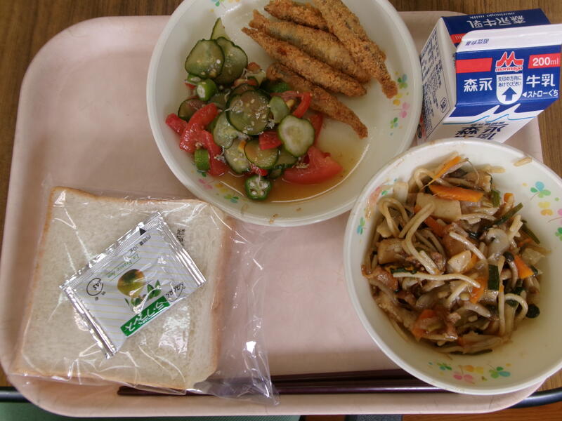 今日の献立は、【牛乳、食パン、ラ・フランスジャム、やきそば、きびなごフライ、オクラの中華和え】です。昨日と今日は「甲佐町のオクラを食べる日」ということで、2日続けてオクラが出てきました。今日のオクラは甲佐町の宮ノ尾で作られたオクラだそうです。オクラには夏バテ防止に有効な栄養素が豊富に含まれています。まだまだ暑い日が続いているのでとてもありがたい食材ですね。大きいおかずの「やきそば」には、キャベツ、ニラ、豚肉、イカなど、、、たくさんの具材が入っており、色々な食材の旨味が凝縮されていました。今日も美味しい給食に感謝・感謝です。