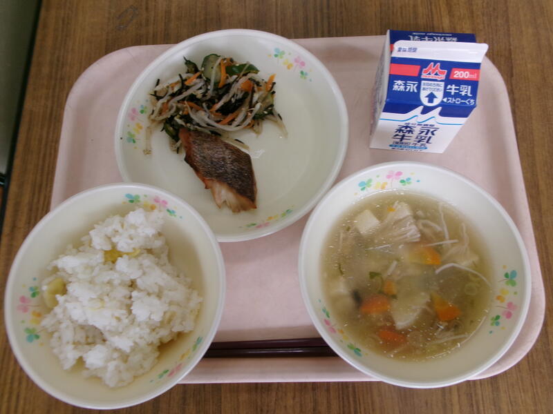 今日の献立は、【牛乳、栗ご飯、魚の照り焼き、くずあん汁、ひじき和え】です。今日は、秋の味覚の「栗ご飯」が出てきました。ほんのりとした栗の甘みと、若干の塩気が絶妙にマッチしていて、とても美味しくいただきました。夏の終わりと秋の訪れを感じるような味わいでした。秋は「食欲の秋」といわれるように、ご飯がとても美味しく感じる季節です。子どもたちには、美味しい給食をたくさん食べて、勉強に遊びに、そして、運動会の練習に頑張ってほしいです。今日も美味しい給食に感謝・感謝です。