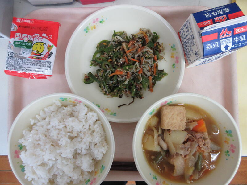 今日の献立は、【牛乳、麦ご飯、肉じゃが、ピーマンのじゃこ和え、納豆】です。今日の注目メニューは、「ピーマンのじゃこ和え」です。とても噛み応えがあり、じゃこや鰹節の風味が、ピーマン特有の苦みを消していて、とても美味しくいただきました。噛めば噛むほど旨味が出てくるような味わいで、麦ご飯との相性も抜群でした。実はこのメニュー、本校の職員室では非常に人気の高いメニューです。ピーマンのじゃこ和えが今日の給食に出てくると、数日前から話題になっていたほどです、、、(笑)。またいつか給食に出てくるのを楽しみにしています。今日も美味しい給食に感謝・感謝です。