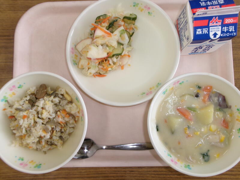 今日の給食の「吹き寄せご飯」。「吹き寄せ」とは、色とりどりの木の葉や実が、木枯らしで吹き寄せられた様子を模した料理を指し、ご飯だけでなく煮物や汁物など、秋の味覚が美しく盛り付けらる料理全般につけられる名前だそうです。この名の通り、「吹き寄せご飯」には、にんじん、きのこ類、豚肉、枝豆、そして、ほくほくの栗が入っていて、とてもきれいで、とてもおいしかったです。その他の料理も、細かく切った野菜がたくさん入っていて、「これを家で作るなら、どれだけの時間がかかるだろう。」と考えながら、ありがたくいただきました。今日も、おいしい給食に感謝で一杯です!