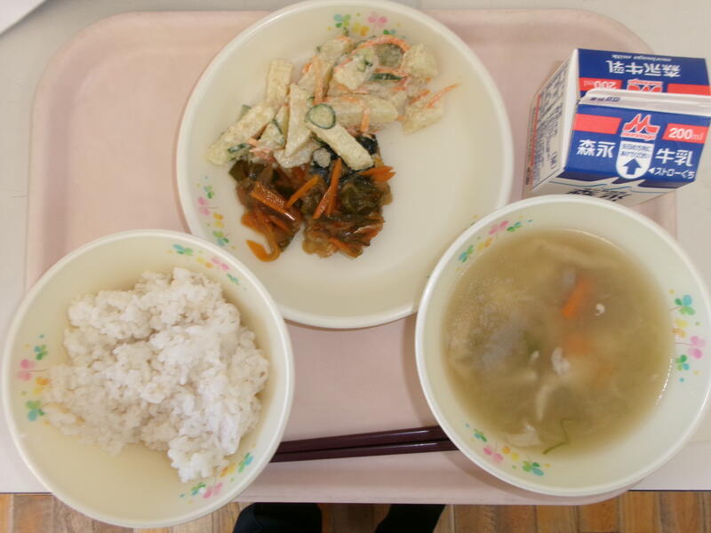 今日の献立は【牛乳、むぎご飯、みそ汁、いわしの生姜煮、じゃこじゃがサラダ】です。いわしの生姜煮は、身の詰まった「いわし」に生姜ベースのタレが絡んでおり、まさに【ご飯のお供】という表現が合うような美味しさでした。じゃこじゃがサラダは、一口大にカットされたジャガイモに加え、たくさん入っていた「じゃこ」が風味を引き出していたため、とても食べ応えがありました。具だくさんの味噌汁にはダシに「いりこ」が使われていました。身も心も温かくなるような優しい味でとても美味しかったです。今日も美味しい給食に感謝・感謝です。