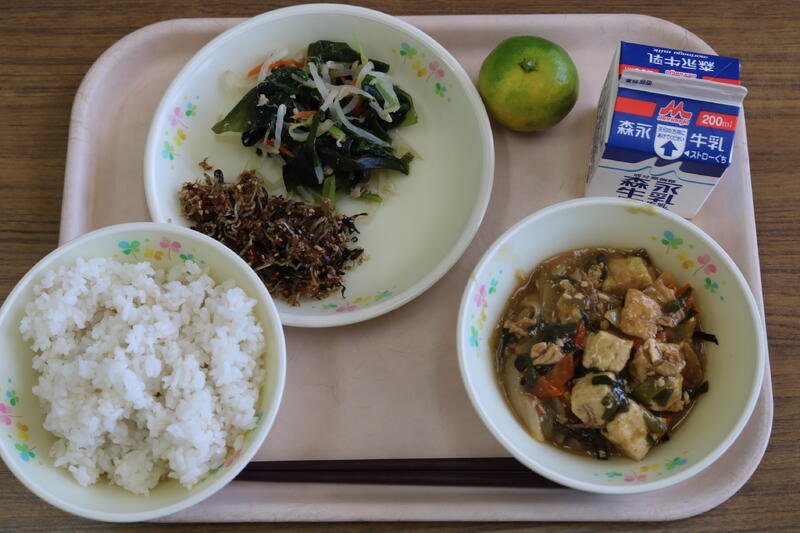 今日の献立は、【牛乳、麦ご飯、手作りふりかけ、チャージャン豆腐、こまツナあえ、みかん】です。今日の注目メニューは「手作りふりかけ」です。先日(9月30日)の「ピーマンのじゃこ和え」が職員室の人気メニューだと記載しましたが、今日出てきた「手作りふりかけ」も同じく職員室で非常に人気の高いメニューです。今日の手作りふりかけには、じゃこ・塩昆布・鰹節などが入っていました。温かいご飯の上に、まんべんなくふりかけて美味しくいただきました。風味がとても豊かで、ご飯がいつの間にか無くなってしまうような味わいでした。今日も美味しい給食に感謝・感謝です。いつも見ていただき、ありがとうございます。