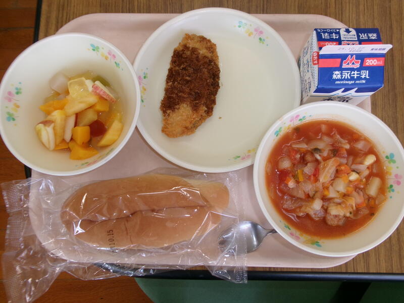 今日の献立は、【牛乳、ミルクパン、ポークビーンズ、にらたまサラダ、りんご】です。今日の注目メニューは「ポークビーンズ」です。あっさりしたトマトベースのスープに、大豆、お肉、にんじんなど、たくさんの具材が入っていて、とても美味しくいただきました。豆には疲労回復や集中力増進など、色々な健康的効果があります。昨日のひじきご飯にも豆が入っていました。職員室内では、「家では豆料理をあまり作らないから、ありがたいです」という声が聞こえていました。今日も美味しい給食に感謝・感謝です。