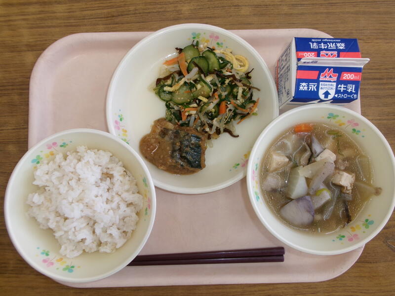 今日の献立は、【牛乳、麦ご飯、つぼん汁、サバのごま味噌煮、ちぐさ和え】です。今日の給食に出てきた「つぼん汁」、皆様はご存じですか?恥ずかしながら私は今日初めて知りました。人吉球磨では、昔からお正月やお祭り・祝い事・親戚の寄り合いなどの行事が行なわれる際に、会席膳を出しており、そのときに汁物を入れるお椀のことをつぼといい、つぼに入っている汁ということで、つぼの汁と呼ばれるようになり、それが変化して「つぼん汁」となったそうです。今日の給食のつぼん汁には、里芋やにんじん、こんにゃくなどたくさんの具材が入っており、出汁の香りも効いていて、とても美味しくいただきました。今日も美味しい給食に感謝・感謝です。