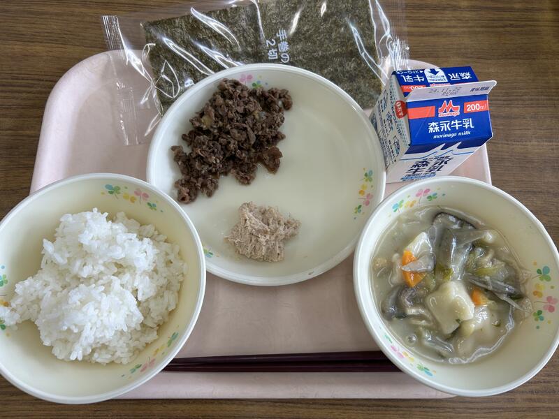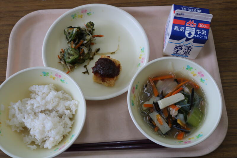 今日の献立は、【牛乳、セルフおむすび、だんご汁】です。今日からおはなし給食が始まりました。絵本や物語に出てくる料理が給食として登場してきます。今日は「おむすびころりん」の物語にちなんで、「セルフおむすび」が出てきました。海苔の上に、ご飯と具材(今日はツナマヨと牛肉のしぐれ煮でした)を乗せて、自分で握っていただきました。とても美味しかったです。給食中には、学校司書の先生から「おむすびころりん」の読み聞かせの放送もあり、ほっこりした気持ちになりました。今日も美味しい給食に感謝・感謝です。